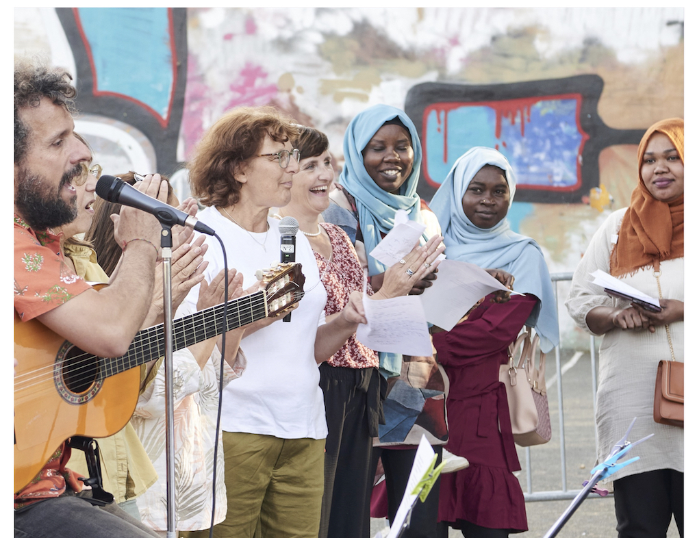(RÉ)INTERPRÉTATION des propositions des participant·e·s par le reste du chœur. Comment sonne une chanson française chantée pour une personne non francophone qui la découvre pour la première fois ? Comment une personne âgée porte un tube actuel ? Comment une jeune personne francophone peut réinterpréter une chanson traditionnelle issue d’une culture non-occidentale ? Le groupe tâche de le découvrir ensemble, guidé par la communication orale et gestuelle.